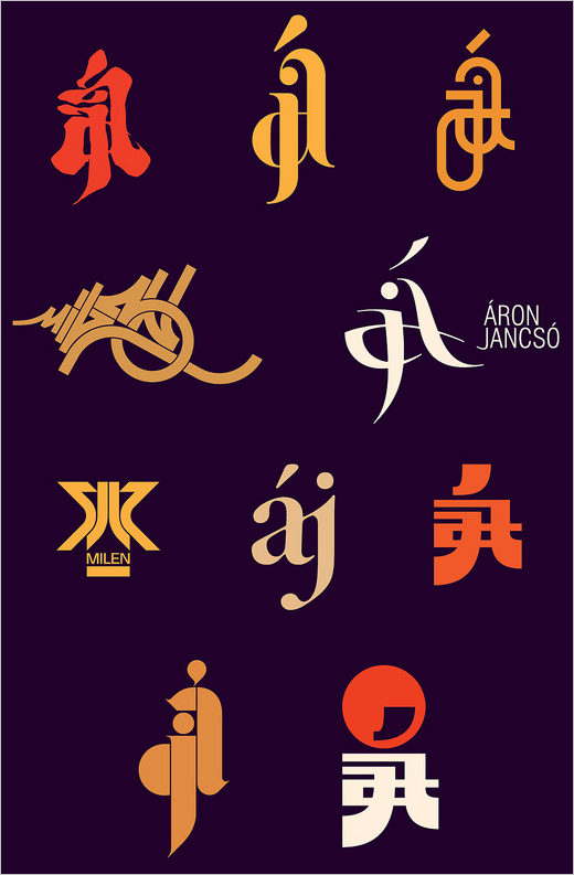 All of these various influences - from Italian Futurism to Russian Constructivism and from Asiatic calligraphy to urban graffiti - can be seen in this one project. The logo design process reveals the shifting, expressive nature of Áron's artistic working method.